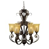 | Italian-inspired Quoizel Fairmont 6-Light Chandelier! This Chandelier draws its inspiration from legends of Italian romance, but with a modern twist! It's alluring and beautiful with a curvaceous design... adding exceptional warmth to your room. It has a malaga finish and Venice gold glass. Six 100W medium base light bulbs are required. 12' of wire and 8' of chain is included. 2'8" x 2'3 1/2". Bring home a touch of romance... order now! Quoizel Fairmont 6-Light Chandelier ...Read more |